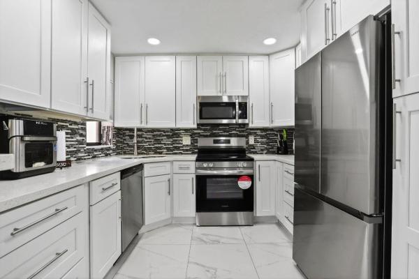 The brand-new modern kitchen showcases sleek white cabinetry, stainless steel appliances, and clean minimalist lines. Enjoy indoor-outdoor living from the screened patio, which includes a full-size washer and dryer with additional storagea rare and valuable feature.