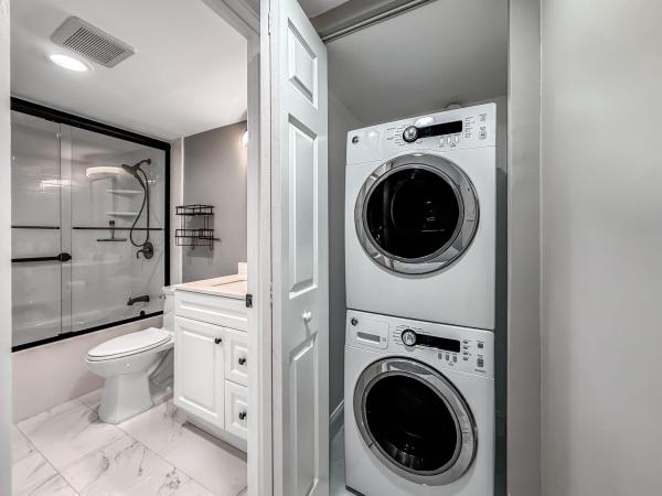 Designer touches create a warm and inviting ambiance from the moment you enter. The generously sized kitchen (2024) features brand-new appliances, sleek quartz countertops, and modern finishes. New tile flooring (2024) flows seamlessly throughout the home, complemented by tastefully remodeled bathrooms (2024) and fresh interior paint. A full-size washer and dryer in-unit add everyday convenience and value. Step onto your private screened balcony and unwind while enjoying peaceful, sparkling lake views -- the perfect setting to relax and recharge in total serenity.