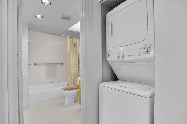This exceptional apartment features modern living with a striking eastern exposure that fills the space with natural light. The gourmet kitchen integrates seamlessly with the living area, perfect for entertaining and relaxation. The serene bedroom offers ample closet space and a spa-inspired bathroom with newer vanities in both bathrooms. The primary bathroom includes a shower, while the guest bathroom has a tub-and-shower combination. An in-unit washer and dryer adds convenience. The living and dining areas are tiled, and bedrooms have laminatel flooring. Recently painted, the apartment also boasts a new air conditioning unit 2025 and water heater installed 2015. Enjoy panoramic water views from the glass-enclosed patio with pull-down shades. See all photos then see for yourself!