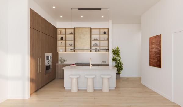 Residents can choose between two kitchen schemes suited to their lifestyle, needs, and personal tastes. Both minimalist styles are anchored by a sculptural stone peninsula and boast premium stone backsplashes, custom wood-veneer cabinetry, a walk-in pantry, and fully integrated gaggenau appliances.