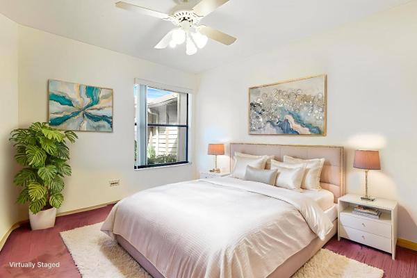 Upstairs, the generously sized guest bedroom pairs with a spacious guest bathroom, while the expansive primary suite offers a large walk-in closet and an ensuite featuring dual-sink vanity, updated shower doors along with peaceful lake views. Upstairs windows also come with hurricane accordion shutters for additional peace of mind.