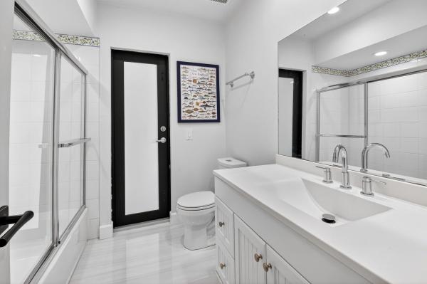 All 3 bedrooms and 2 full bathrooms are thoughtfully situated on the left wing of the home, offering privacy and functionality. The 2 spacious guest bedrooms have been beautifully updated to combine comfort, style, and versatilityperfect for overnight guests, a dedicated home office or playroom. Each room features wide-plank luxury vinyl flooring, elegant crown molding, neutral designer paint, and generous closet space, while large windows fill the rooms with natural light and offer tranquil garden views. The adjacent guest bathroom complements these spaces with custom cabinetry, a marble vanity, designer fixtures, and a tub-shower combination framed in glass with gold accents.