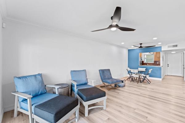 The updated kitchen showcases a partial intracoastal view, modern high-hat lighting, and knockdown walls for a bright, open feel. Beautiful new tile flooring, new roofs (2025), and fresh exterior paint enhance the appeal, while hurricane-impact windows and a new impact front door provide peace of mind. Updated electrical panel, new microwave, new hot water heater, a ventless washer and dryer is conveniently located within the unit, replaced motor, capacitor & emergency safety float switch 1/31/2024 a/c, wine cooler.