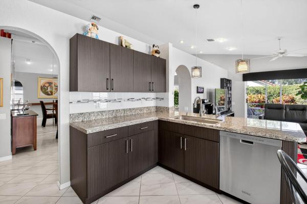 This beautifully maintained residence offers exceptional value and peace of mind with a brand new roof completed august 22, 2025 and a stunning, full glistening lake view that creates a serene and picturesque backdrop for everyday living. Gently used by its snowbird owner, the home has been meticulously cared for and lightly lived in. Designed for both comfort and elegance, the home features ceramic tile throughout the main living areas and a versatile den that can be easily converted into a third bedroom. The open, eat-in kitchen is ideal for casual dining and entertaining, showcasing granite countertops, tile backsplash, snack bar seating, pull-out shelving, and a large pantry, all flowing seamlessly into the family room. The great room serves as a formal living room and dining room provide refined spaces for gatherings, while tray ceilings in the foyer, primary bedroom, and primary bath add architectural character. The spacious primary suite includes large dual walk-in closets and a luxurious ensuite bath with granite vanities, dual sinks, a roman tub, and a large walk-in shower. The split floor plan ensures privacy for guests, with a second bathroom featuring a granite vanity and glass-enclosed walk-in shower. Additional highlights include crown molding throughout the living areas, volume ceilings, keypad garage entry, and full accordion shutters for added storm protection and convenience. Schedule your private showing and see for yourself why this home stands out from the rest.