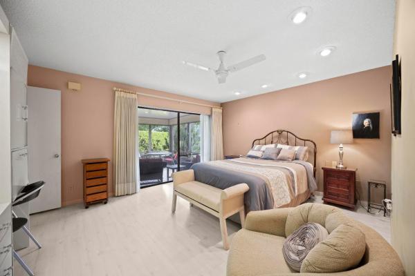 Welcome to the serene neighborhood in the florida room, offering uninterrupted views of the tranquil lake. Continue the outdoor extravaganza on the noticeably extended patio, measuring 10 x 32, a unique attribute only this property holds. Retreat after a long day into the generously spaced master bedroom, boasting a commodious walk-in closet and dual window setup for the ideal atmosphere. Attached is the en-suite master bathroom, offering two vanities, a roman tub for luxurious relaxation, a separate shower stall, and a neat linen closet.