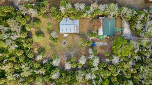 The fully cleared parcel includes no wetlands, a rock driveway, front and rear fencing, and a screened lanai with space planned for a future pool. Additional structures include a 46' x 20' pole barn with electricity, plumbing, 220v power, shelving, and a built-in workbench, plus a 26' x 20' concrete block carport and covered parking. Exterior features also include two ring cameras and a ring doorbell.