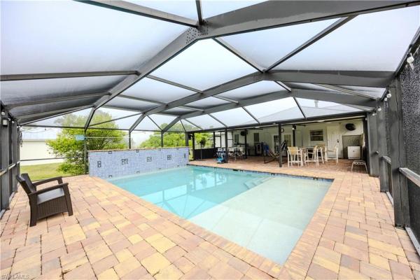 Inside, fine craftsmanship unfolds in every detail. Coffered ceilings, crown molding, and tall baseboards bring depth and refinement to open living spaces. The grand living room, complete with a custom built-in wall unit, ambient lighting, and wet bar, transitions effortlessly through glass sliders to a tiled, screened lanai. Designed for year-round enjoyment, this inviting space lives like an outdoor salon—complete with chandelier, ceiling fan, surround sound, and electric shutters for privacy and comfort.
