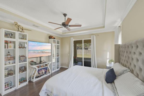 Exceptional opportunity to own this beautifully maintained craftsman-style residence. Ideally situated on a spacious corner lot, the property offers a three-car garage, additional concrete driveway parking, and an extended concrete pad alongside the garage, perfect for toy storage. A welcoming covered front patio sets the tone for the home's inviting atmosphere. Upon entry through the decorative front door with dual sidelights, you are greeted by a formal living and dining area just beyond the foyer. Cream-colored ceramic tile flows throughout the main living areas, enhancing the home's bright and cohesive design. Multiple access points to the rear patio, from the living room, family room, and primary suite, create a seamless indoor-outdoor lifestyle. The expansive kitchen features a dedicated dining area and counter-height seating, ideal for casual gatherings. Appointments include stainless steel appliances, a large center island with additional storage, white shaker cabinetry, quartz countertops, a glass subway tile backsplash, and elegant upper-cabinet lighting. The adjoining family room provides a comfortable and functional space for everyday living and entertaining. Plantation shutters throughout the home add timeless style and a relaxed florida aesthetic. The primary suite is a true retreat, showcasing wood-look tile flooring, generous proportions, cove ceilings, dual closets, and a chandelier-style ceiling fan. The spa-inspired ensuite bath features a centrally positioned jetted tub, a spacious walk-through shower, split vanities with dual sinks, and a private water closet. Three additional guest bedrooms and two full bathrooms provide ample accommodations, including one bathroom with wheelchair-accessible tile flooring. The laundry room is thoughtfully designed with built-in storage and a utility sink. Outdoors, enjoy a private screened oasis offering both covered and open patio spaces. The covered lanai boasts a stunning wood ceiling and ample room for entertaining. Accordion shutters protect the patio doors, while paver accents enhance the overall ambiance. The beautifully landscaped corner lot also features gutters, solar panels, and the added benefit of no hoa fees or restrictions. This exceptional property offers comfort, style, and flexibility, your dream home awaits.