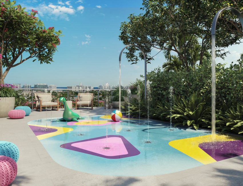 A 10,000 square foot Rooftop Amenity Deck features multiple pools, lounge and play areas, and verdant landscaping.