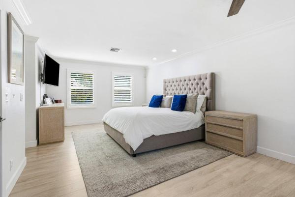 Townhouse for sale in Cambridge Park At Woodfield Country Club5696 NW 39th Ave #23, Boca Raton, FL 33496 Stunning turnkey two-story 3 bd 3.5 ba in cambridge park at woodfield country club, offering serene lake views and high-end modern finishes throughout. The open living space is flooded with natural light, with french doors leading to a particularly expansive refurbished patio for the subdivision. An accent wall behind the tv adds a subtle touch of luxury and refined design. The kitchen is a true centerpiece of the home, featuring dual-tone blue and white cabinetry with gold accents, white counters, updated appliances, ample storage, and a large central island with seating. Adjacent, the dining area offers patio access and lake views. Upstairs, the primary bedroom is spacious and bright, with windows on either side enhancing the sense of openness. The updated ensuite includes a soaking tub, a private shower, and his-and-hers sinks. Two additional bedrooms share a beautifully upgraded jack-and-jill bathroom. The spacious outdoor patio features stylish wood paneling, both covered and open-air areas, and a gate leading directly to the lake. The space is ideal for relaxing, entertaining, or simply soaking in the stunning lake views and gentle breeze.