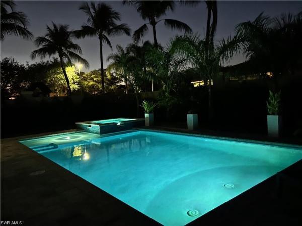 The true showstopper is the private outdoor retreat, designed for exceptional entertaining. Enjoy a heated saltwater pool and spa operated by a pentair smart control system, surrounded by mature landscaping and privacy fencing creating a serene, resort-style escape rarely found in southwest florida. The space is complete with an outdoor ceiling fan, wall-mounted tv, and flat-top grill, ideal for effortless alfresco dining. An in-home gym adds even more versatility to this thoughtfully designed property.