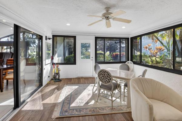 This elegant three-bedroom, three-bath home is situated on a corner lot and offers picturesque views of both water and the golf course. Updated kitchen features white shaker cabinets w/solid surface counter top plus breakfast nook. Screen enclosed side patio is ideal for outdoor dining. Large living room includes a built-in wet bar with additional storage. Formal dining room and family room are enhanced by custom built-ins. The family room opens onto a glass-enclosed florida room equipped with air conditioning. The primary bedroom is outfitted with integrated furniture, a large walk-in closet, and a beautifully renovated ensuite bathroom boasting a spa tub, separate shower, and dual vanity. Bedroom two has an en-suite bathroom plus walk-in closet. Bedroom three is large with big walk in