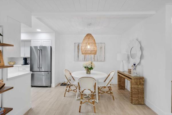 Light and bright interiors are complemented by a refined coastal aesthetic throughout. Home features include a beautifully appointed kitchen with kitchenaid appliances, white cabinetry and quartz counters. High-hat lighting made possible by a drop ceiling accented with wood paneling. Wood-look porcelain flooring flows throughout, enhancing both style and durability. Additional highlights include built-in laundry, custom built-in closets, and thoughtfully designed interior finishes. Significant upgrades provide peace of mind, including a new electrical panel (2020) and new a/c (2020). The community has undergone recent improvements, including a new roof and gutters installed within the last year, freshly painted exterior, newly installed patios, a new trash containment area, and outdoor furniture for the patio areas. The parking lot was recently blacktopped.