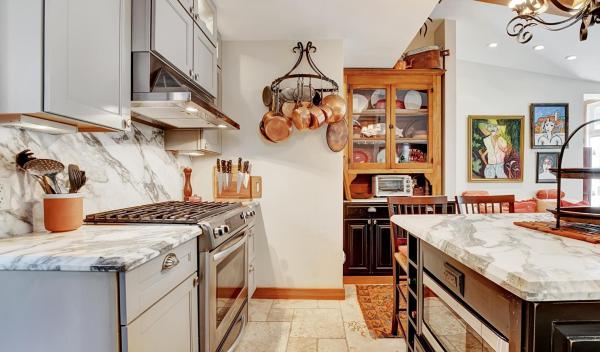 - exquisite carrara marble countertops and backsplashes/stove surround