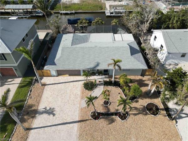 This exceptional waterfront property showcases impeccable craftsmanship, modern comfort, and coastal island beauty in perfect harmony. Set along a 75' wide canal with direct gulf access, this 2, 372 sq. Ft., 3-bed, 3-bath+office home is designed for those who appreciate quality, elegance, and effortless indoor-outdoor living. Just 1.5 blocks from the beach with deeded access, it is surrounded by homes of like stature, offering a refined setting that enhances privacy and prestige. From the moment you step inside, soaring 10' and 12’ ceilings, solid core 8’ doors, oversized base trim, and lighted tray ceilings create an inviting yet sophisticated atmosphere. Plantation shutters, custom lighting, and crisp interior and exterior paint further elevate its timeless appeal. The kitchen balances style and function, featuring brand-new stainless steel appliances, under- and over-cabinet lighting, and custom cabinetry designed for efficiency. The adjacent laundry room is fully outfitted with new appliances to simplify daily living. Step outside to an outdoor living space for relaxation and entertaining, where a free-form pebbletec swimming pool and spa sit within a two-story screened enclosure, offering a tranquil escape with breathtaking water views. The shellrock pool deck remains cool underfoot even when in direct sunlight all day. Strategically placed palm trees and opaque lanai panels provide privacy without obstructing the serene surroundings. A covered lanai with solar sunshades creates the perfect space for dining or unwinding. From this vantage point, the view across the canal remains beautifully intact, reinforcing the peaceful setting.