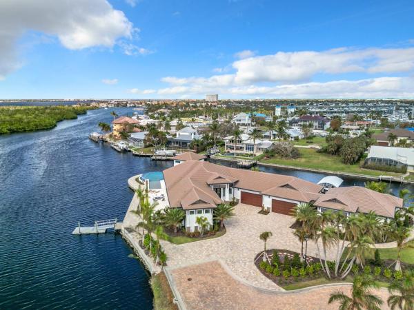 This one of a kind property features ultimate privacy in this exclusive, gated waterfront community. Brand new premium construction by award winning builder, windward construction, on a near triple corner lot with nearly 500 feet of seawall, all of which has extra elevation to keep you high and dry. This exquisite smart home features nearly 7000 square feet under air including a massive garage with rear bay doors for ease of transferring supplies to your boat. A boater's paradise with deep water direct access to the gulf of mexico. Station your yacht on the 100 foot floating dock with ramp and store your tender boat on its own lift. Utilize the additional 7, 500 lb covered lift for your every day watercraft. A total of 5 bedrooms with designated full bathrooms and 2 half bathrooms, one of which is accessible from the pool area. The in law suite with private entrance is an impressive 2 bed, 2 bath alluring space with its own private patio. A welcoming open floor plan features a great room with a backlit granite wall with built in linear electric fireplace and sublime wood beams on the cathedral ceilings. The remarkable outdoor area includes a summer kitchen with built in gas grill, expansive seating area including gas fireplace area, a heated infinity edge pool with integrated spa and lengthy shallow walkout. The spiral outdoor stairwell takes you to a bonus air conditioned room with a breathtaking view which can be utilized in so many different ways. The elegant shell stone tile flows through the home and beyond the pocket sliders bringing a seamless transition to the expansive outdoor living area. This is a custom built home with the florida lifestyle very much at the forefront of every aspect of construction and design including a 1000 gallon propane tank that will operate the generac home generator for weeks! Impact doors and windows and dual electric hurricane and insect screens provide added protection to the lanai area. Located just off mcgregor blvd., minutes from beaches, restaurants, and shopping and only 6 miles from the private airport, page field and 16 miles from fort myers international. The staging furniture has been removed and the home is ready for quick occupancy.