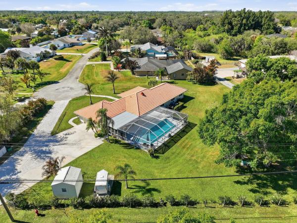 Desirable white city pool home located on .50 acres with an extra, hurricane rated with impact windows building (18x22) on a concrete pad with electric;, plus a 50amp rv hook-up. The home features city water/septic; 3 bedrooms and 2 full baths, one which is a cabana bath leading to the extra large pool/patio area that is perfect for entertaining; an outdoor shower; walk-in closet in the primary; screened garage; 2024 roof, 5 year old a/c, newer hot water heater, gfi's; and, a new pool timer and garage door opener. The exterior is freshly painted with leaf filter gutters and new screens. This home has been meticulously maintained. Enjoy the walkable neighborhood and the near-by park that leads to the river. Flood insurance is not require