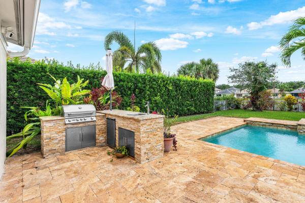 The private backyard offers stunning lake views, and is fully fenced with mature well maintained hedges for privacy, an outdoor kitchen with a built in grill, mini fridge and sink. The covered patio has an electronic awning that extended over part of the pool. The custom salt water pool has a sun shelf with bubblers and 2 umbrella holders as well as a table area with spa jets and seating throughout the pool area.