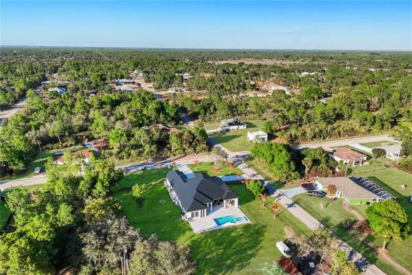 Extraordinary architectural estate situated on 1.25 acres, offering 3, 458 sq ft of refined living space and 4, 801 sq ft total. Designed for modern luxury with seamless indoor-outdoor living. A striking arrival begins with a miami-grass–style driveway and double entrance, complemented by custom oversized modern wood doors, a sleek metal roof, tray ceilings, and black accent features throughout. The primary suite features custom european-style cabinetry, a boho-inspired quartz vanity and statement shower, led lighting, dual sinks, and spacious walk-in closets. All bedrooms offer en-suite bathrooms and walk-in closets, providing comfort and privacy throughout. Interior highlights include porcelain tile flooring, a curated coffee bar, and a chef’s kitchen with top-of-the-line samsung stainless-steel appliances. Outdoor living is elevated with a paved saltwater pool (7-ft depth), a fully equipped outdoor kitchen with granite countertops and refrigerator, and expansive grounds ideal for entertaining or relaxation. Additional features include a whole-home generator, stucco-finished soffits, full-perimeter gutters, a three-car garage, and dual laundry areas with epoxy flooring. Located in lehigh acres, this rare offering combines architectural elegance, acreage living, and modern luxury.