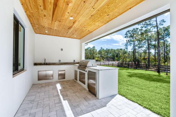 Experience unparalleled luxury and craftsmanship in this meticulously designed custom home, showcasing unique upgrades and premium finishes throughout. Nestled on a beautifully landscaped lot with a 4' privacy fence, the property is enhanced by a lush st. Augustine lawn maintained by a sprinkler system. The owners have invested well over $60, 000 to properly fill and elevate the lot, ensuring superior drainage and eliminating any potential water-related concerns for years to come. A whole-house reverse osmosis system and a 4'' deep well with pump ensure exceptional water quality and efficiency. The exterior boasts energy-efficient double impact argon-filled windows and 8' doors with custom handles, while the interior features expansive 16' sliding glass doors that lead to a (continued) stunning porch with a custom-built wood-burning fireplace.
