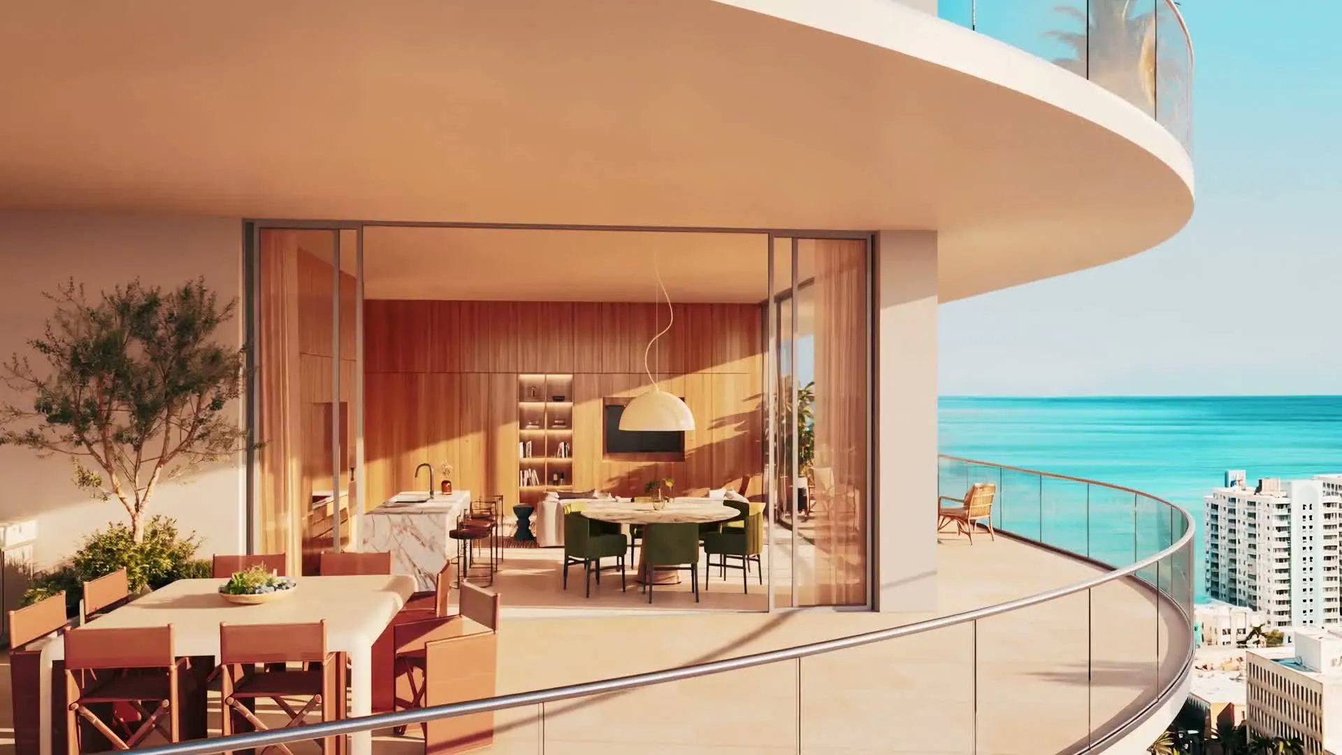 The wrap around terraces is a signature hallmark of each residence. Extra-wide, they are designed as outdoor living spaces, for lounging and dining, with panoramic ocean, Intracoastal Waterway and direct park views. Select homes feature an integrated summer kitchen.