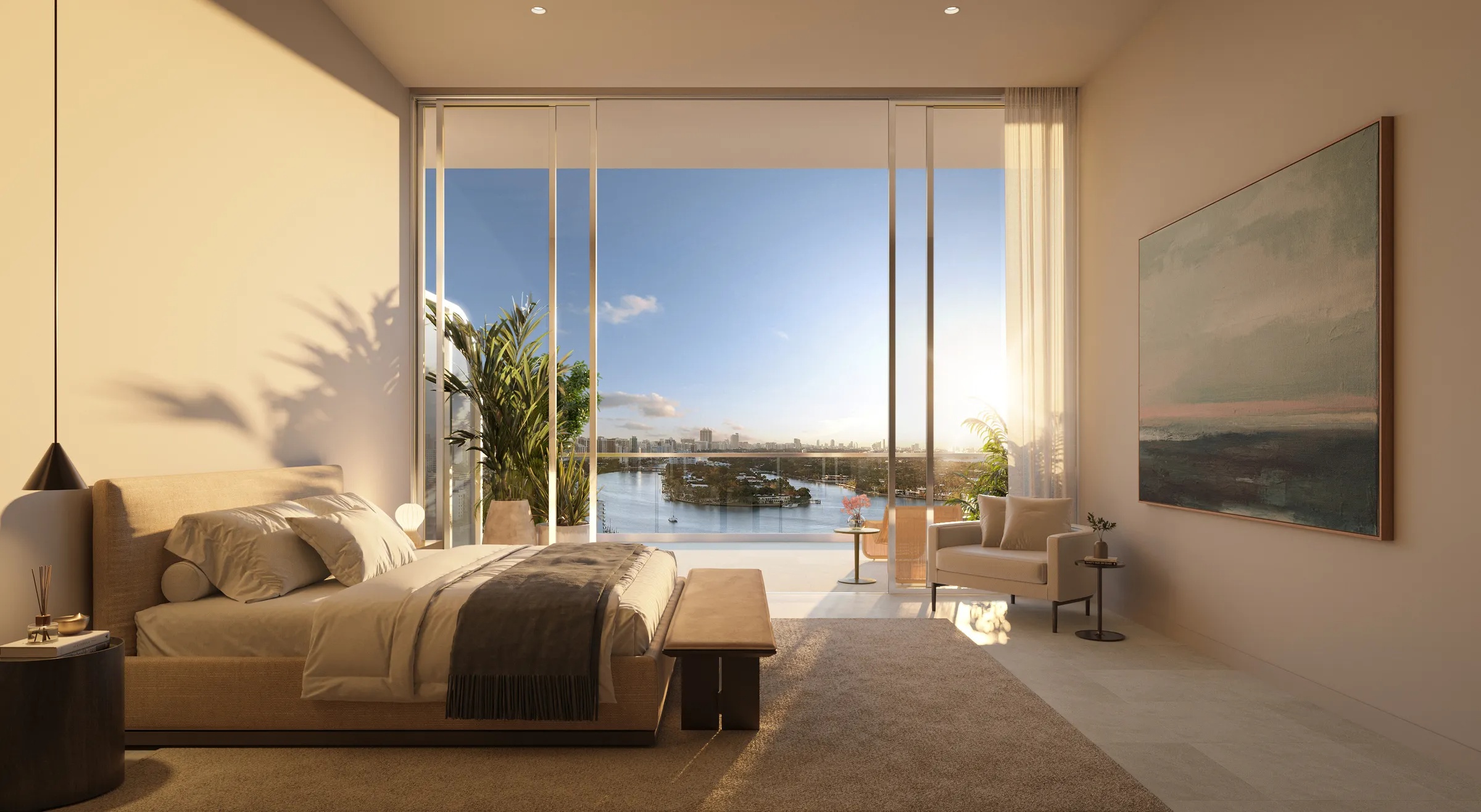 The interiors of the one-, two- and three-bedroom condominium residences and penthouses exhibit a natural beauty with an elevated level of Italian craftsmanship. Floor-to-ceiling sliding glass doors invite wondrous light to bathe each home from sunrise to sunset.