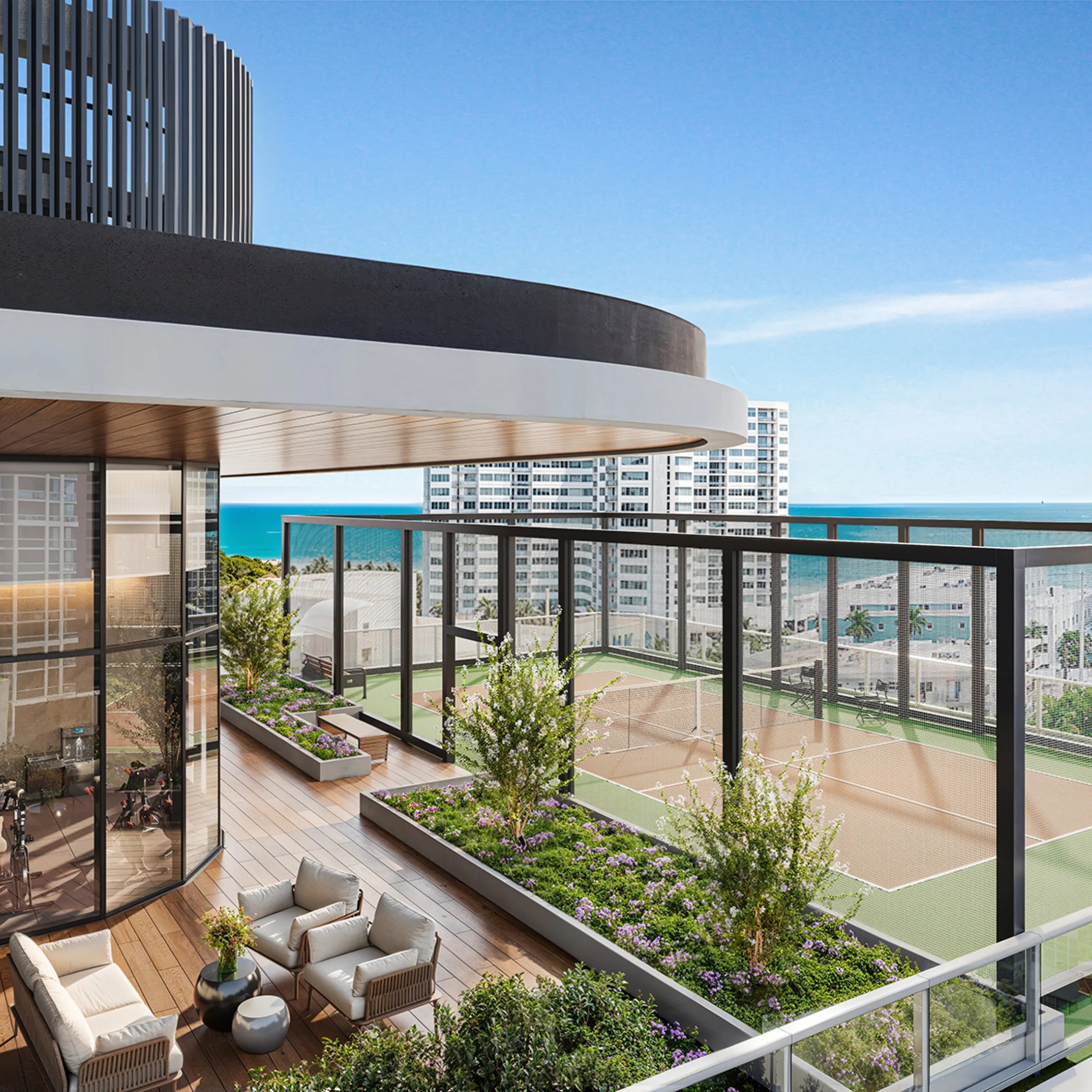 Begin your day in the fitness center with expansive rooftop views. Enjoy an on-site sunny swim with 360-degree water views, a friendly game of pickleball or stroll East to the nearby beach. Experience endless dining options available right outside of your doorstep.