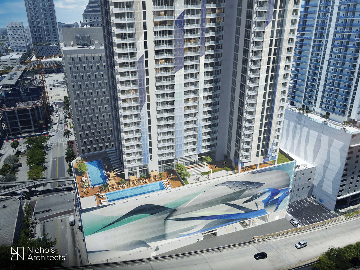 The residential units are expected to be a mix of studio, one-bedroom, and two-bedroom apartments, totaling 507,070 square feet. The ninth floor will be dedicated to amenities, including a landscaped outdoor deck with two pools. The project aims to enhance the streetscape with aluminum-framed window wall systems and integrated art murals selected by the Miami Parking Authority for the eight-story parking garage.