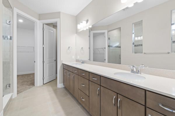 The primary suite is a quiet sanctuary featuring a tray ceiling, walk-in closet, and spa-inspired bath with dual vanities and an oversized walk-in shower. Every detail reflects the comfort, efficiency, and elevated style of new constructionthis home has never been occupied.