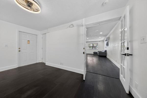 The ground-floor primary suite features an en-suite bathroom with dual sinks, a soaking tub, separate shower, and sliding doors to the screened patio. Additional bedrooms include large walk-in closets. The home also offers a first-floor powder room, extra storage under the stairs, and a modern attached one-car garage. New roof.
