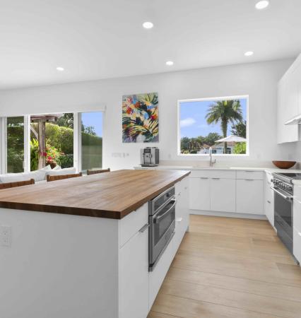 The heart of the home—its modern, fully renovated kitchen— boasts stunning quartzite countertops, high-end appliances, and sleek finishes that blend luxury with everyday practicality. Each of the four bathrooms vanities have been stylishly updated, including the spa-like primary suite with contemporary design elements.
