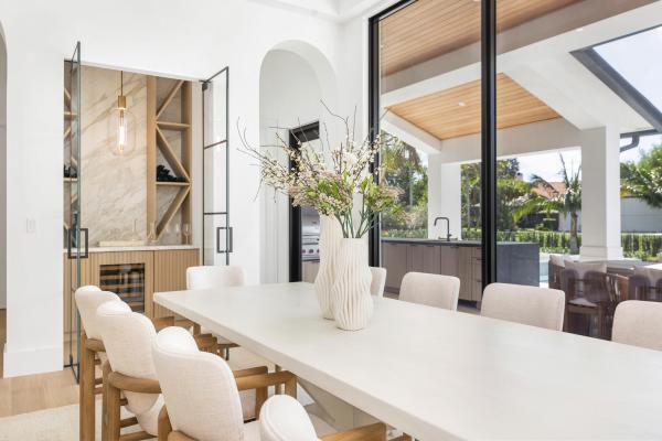 the 7, 551 square foot house welcomes you with a tall double front door leading into an impressive living room with 15-foot ceilings and floor-to-ceiling glass doors. Engineered wood flooring, natural stone, and porcelain tiles create a cohesive and sophisticated aesthetic throughout the home. The spacious kitchen features a walk-in pantry, high-end appliances, and a 7.5 by 7.5-foot quartzite island, perfect for culinary enthusiasts.