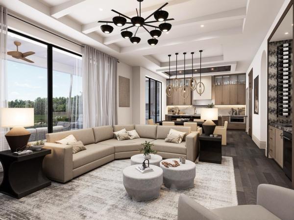 The master bedroom has 12-foot ceilings, double closets, and an en-suite bathroom. Each of the three extra bedrooms has 12-foot ceilings, en-suite baths, and walk-in closets. A flexible room provides the option to serve as a bedroom or office, with direct access to the living area. Additional amenities include a laundry room, a three-car garage, and a large gym overlooking the pool, grass field, and horse arena.