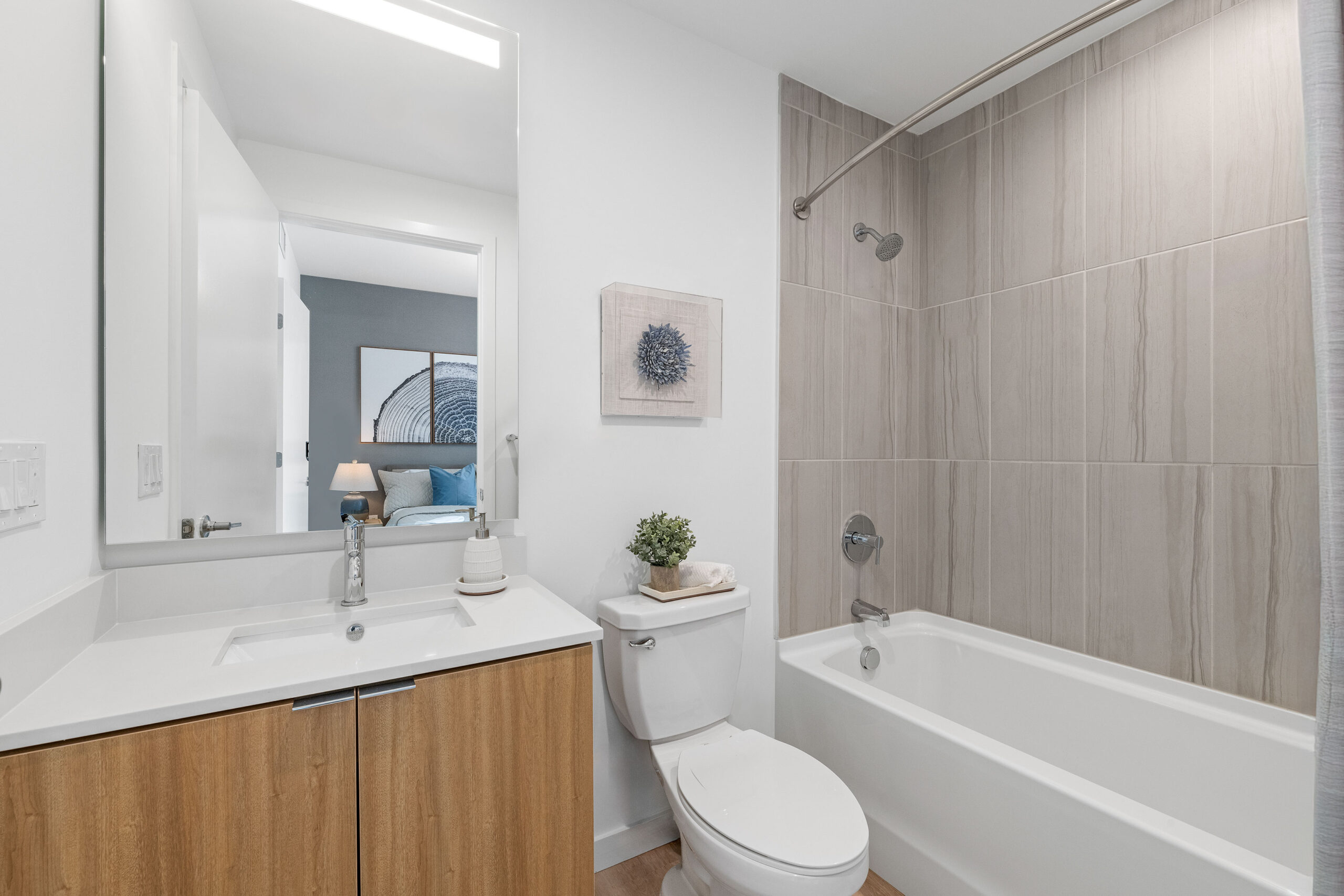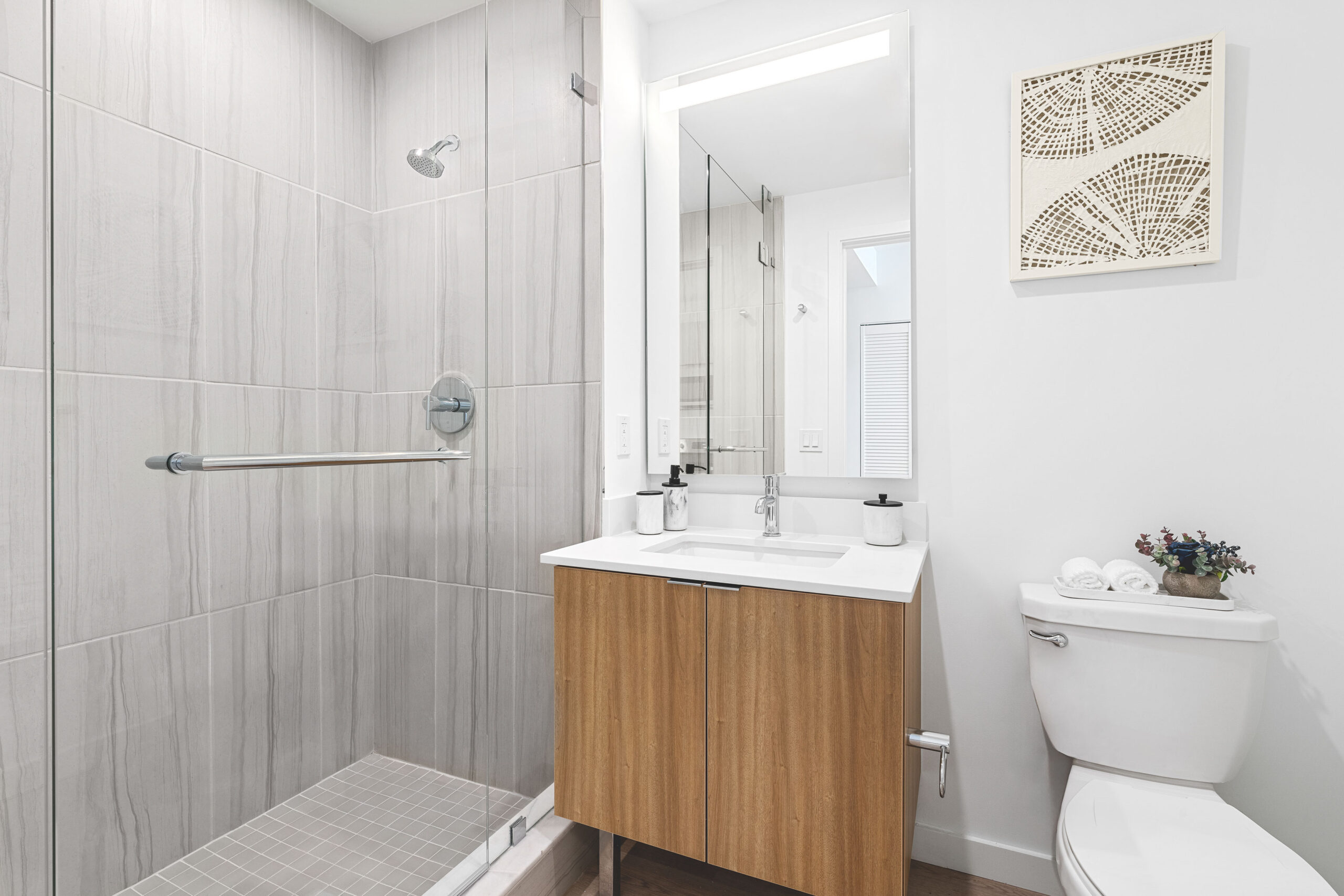 Bright and modern, the baths offer a sleek sanctuary for daily regimens. The warm-toned wood vanities and flooring complement the flecked quartz accent walls, for a fresh yet sophisticated design.