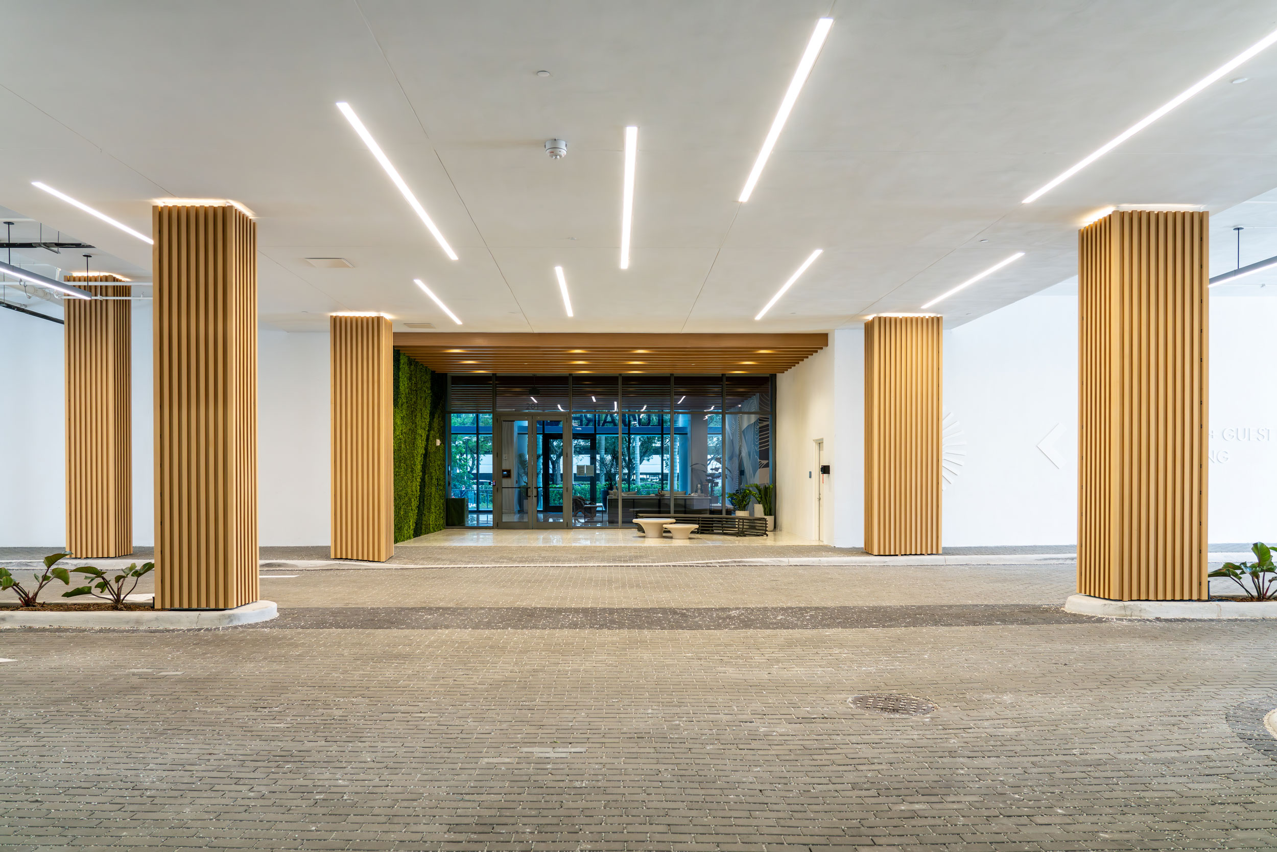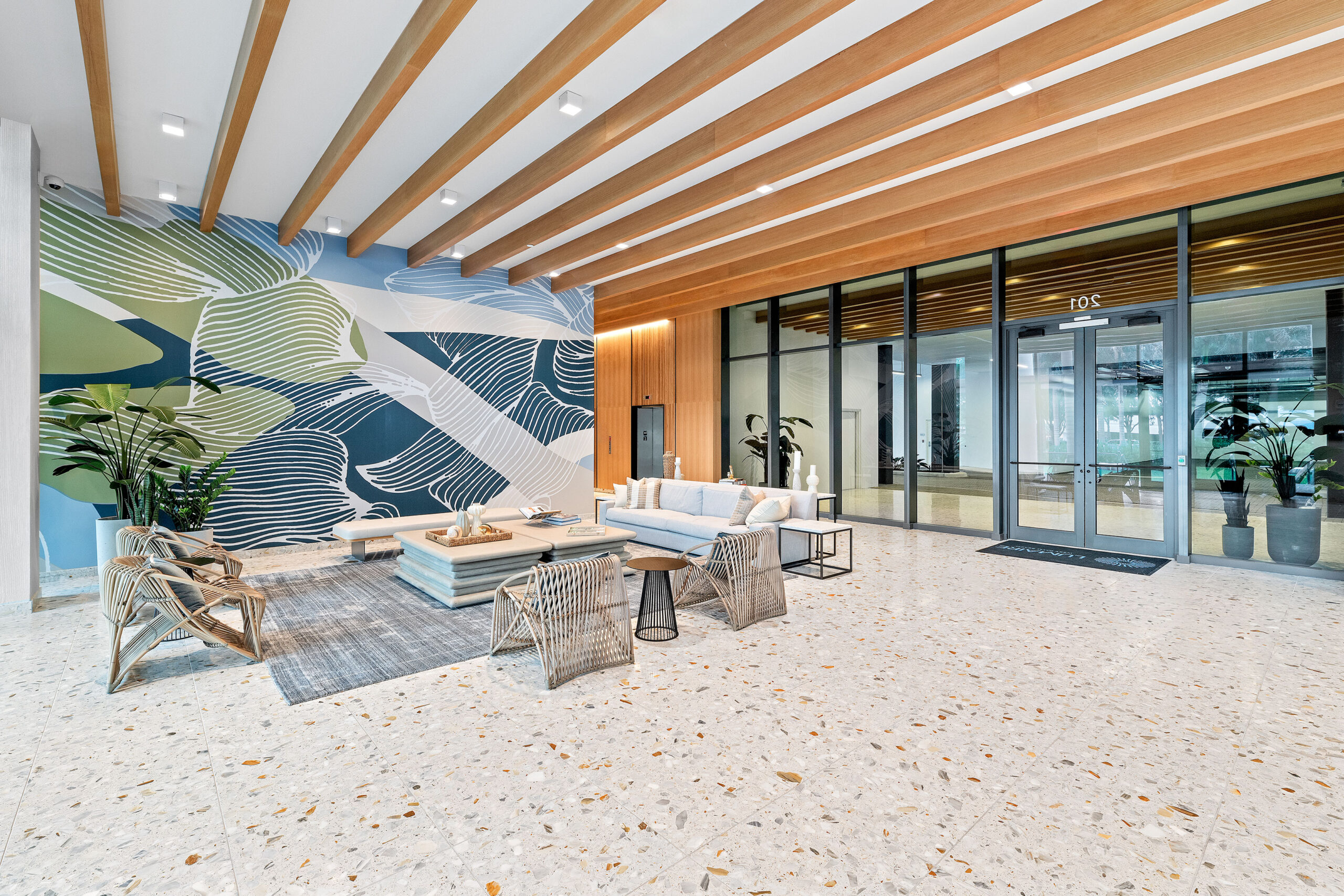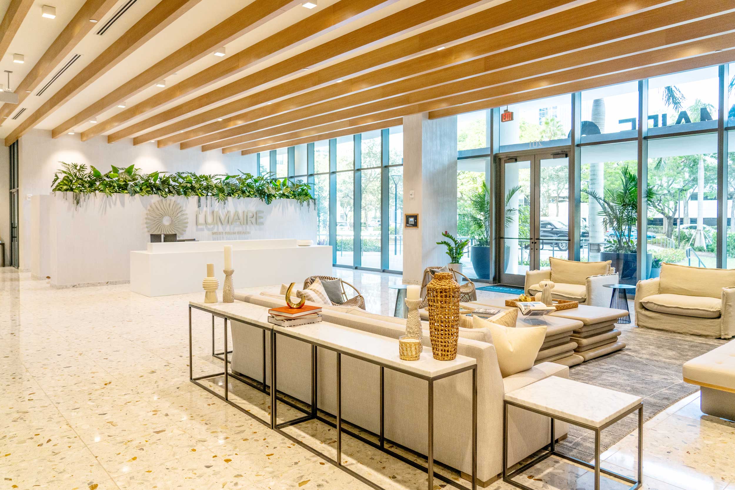 The Porte Cochère and lobby set the tone for an elevated living experience at Lumaire. Soaring ceiling heights, warm wood tones and terrazzo floors with a beaut ...more