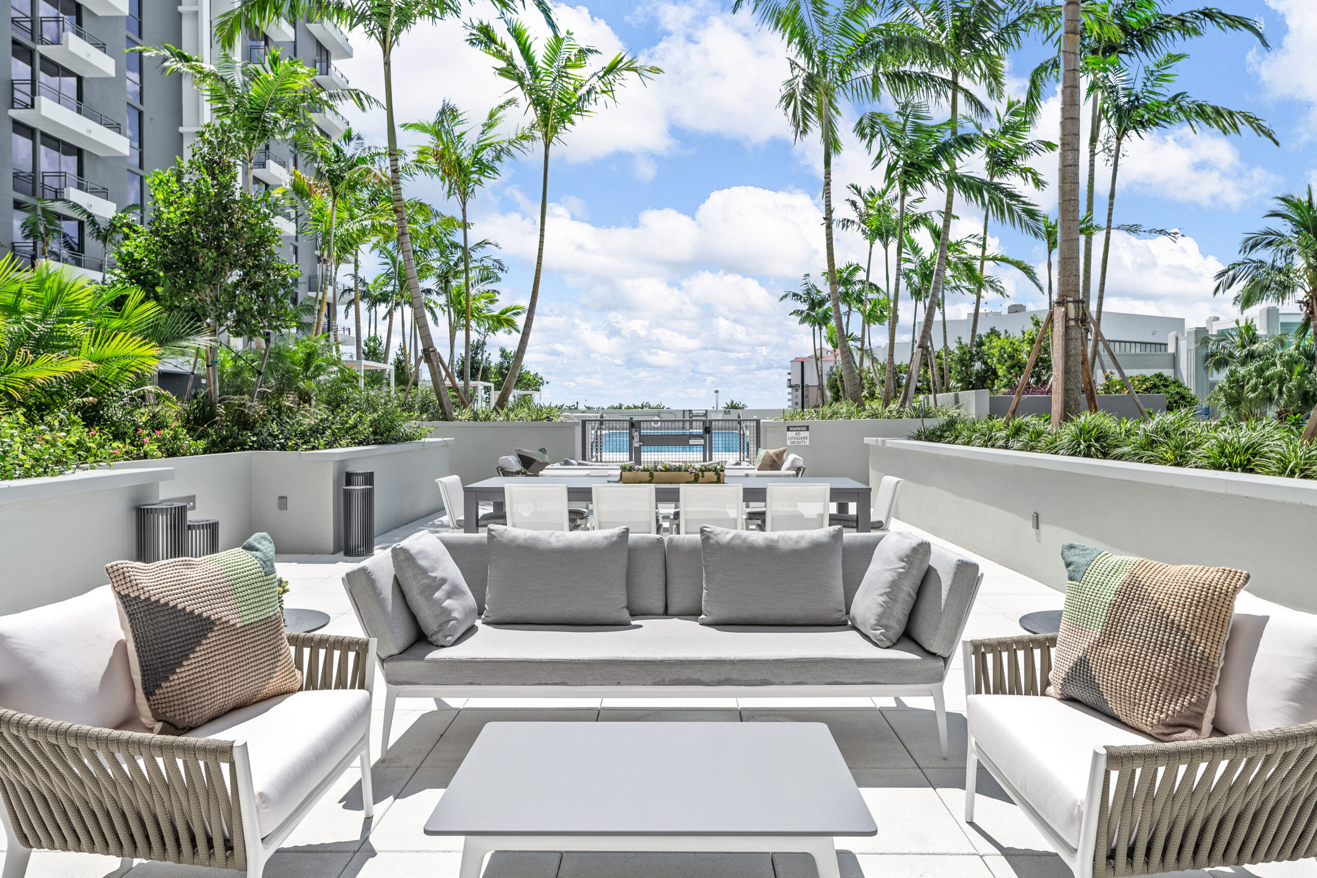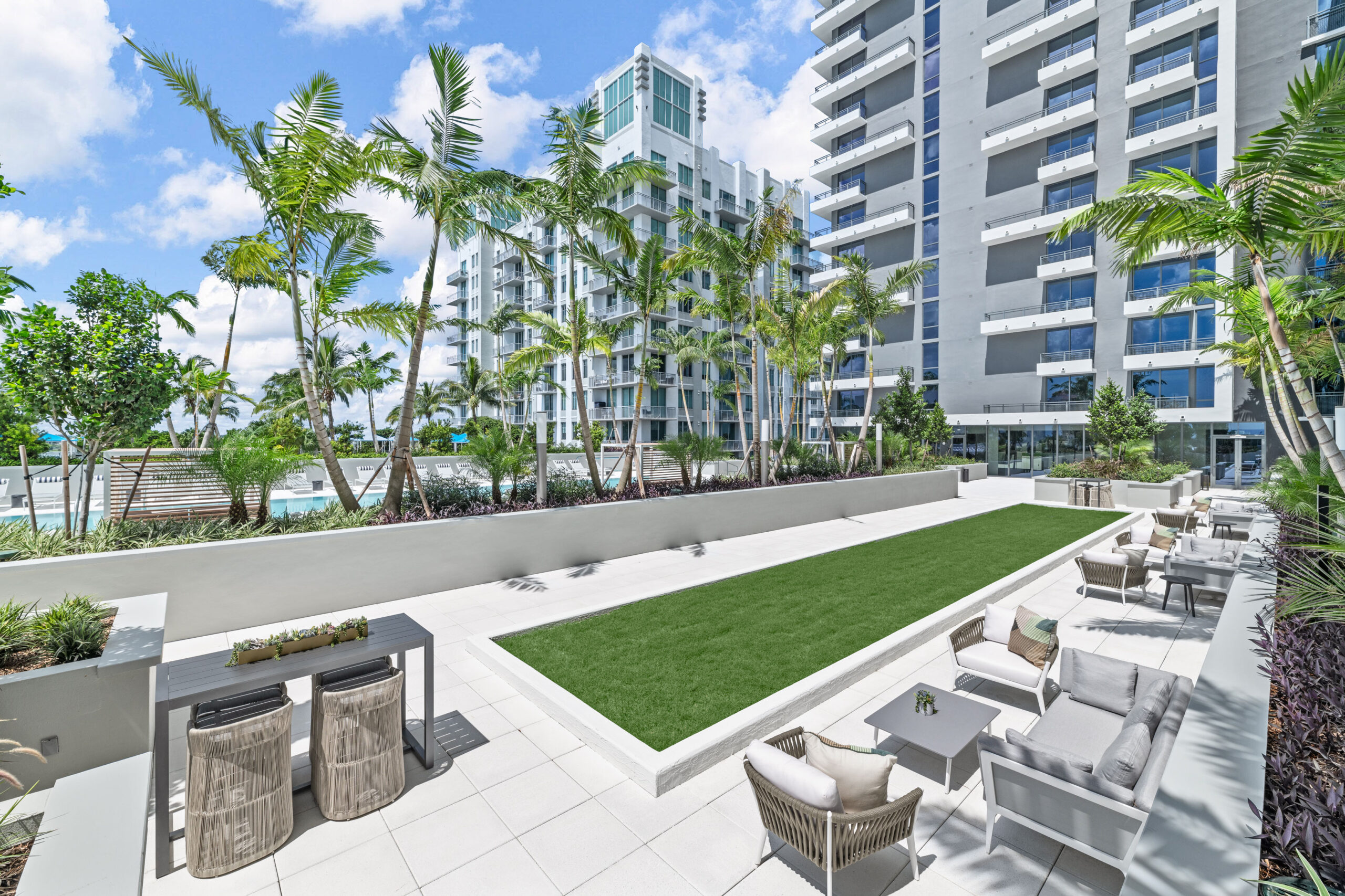 The Porte Cochère and lobby set the tone for an elevated living experience at Lumaire. Soaring ceiling heights, warm wood tones and terrazzo floors with a beautiful glass entrance brings the outdoors inside and overlooks the lushly landscaped courtyard with benches and tables perfect for enjoying with friends. Our resident services enhance and complete the Lumaire experience.